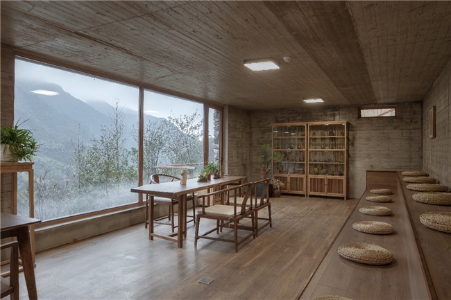 在原舍揽树,入住者的体验远不止于“在房间睡觉”那么简单。这里的每一间客房都采用层层退台的设计,每一扇窗都是一幅天然的山水画,无论身处哪个房间,都能将山谷的绿意与云海的壮阔尽收眼底。房间内部的装修简约而不失格调,本土木材打造的家具、质朴的夯土墙肌理,与窗外的自然景观相得益彰,让人仿佛置身于自然的怀抱之中。