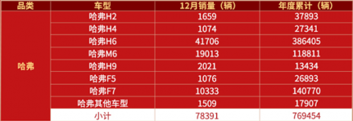2019年12月,哈弗品牌销量达到78391辆,高居中国SUV月度销量榜首。同时,哈弗品牌全年累计销售共769454辆,再度斩获中国SUV年度销量冠军,这也是哈弗品牌第10年蝉联此奖项。在风云变幻的车市之中,哈弗品牌带领中国品牌抵御合资冲击,积极向上,尽显冠军风姿。