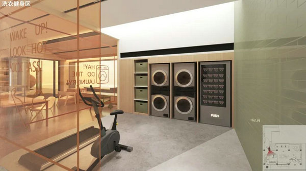 对于住在悦享酒店的商务人士,酒店大堂专门设计了24小时开放的共享生活服务空间。 这里健身器械、洗衣机功能一应俱全,既能满足商旅出行的洗衣需求,又能满足健身爱好者日常的生活习惯。
